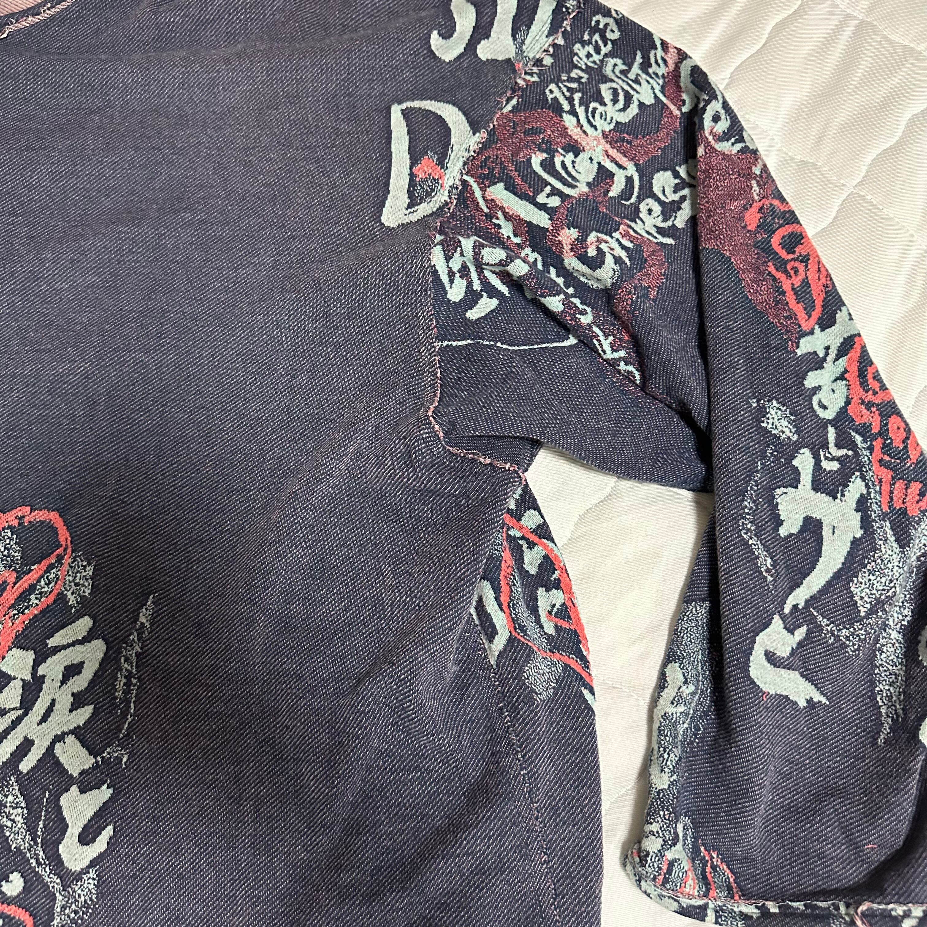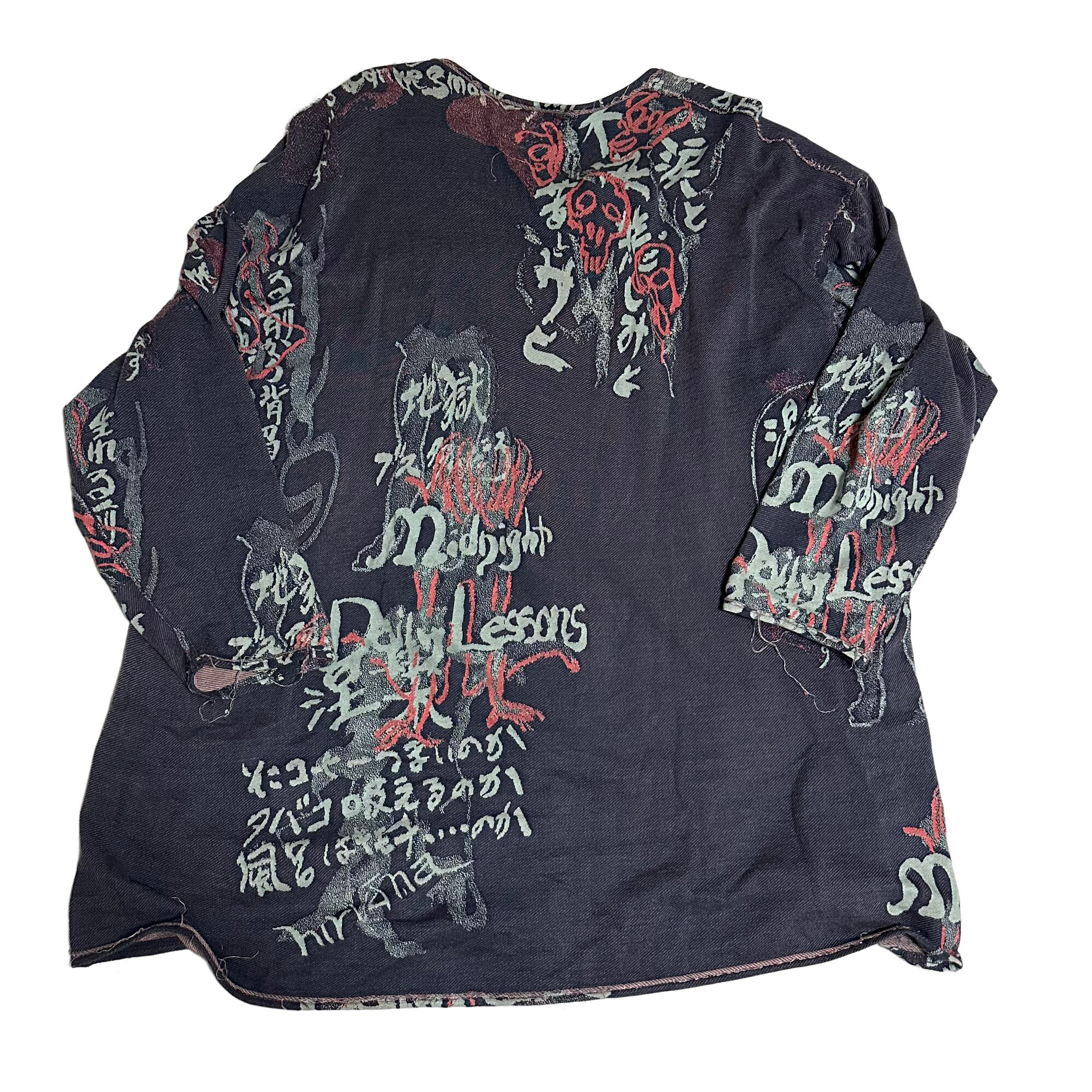 山本耀司氏が考える仏教観をデザインソースに、涅槃を意味するnirvanaの禍々しい文字や、世の中に対する投げかけを服にのせ、ニットのようなふっくらとした素材感をコットンで表現。
